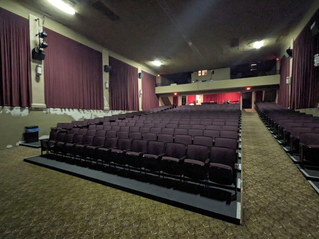 The theatre has 325 seats on the floor. There is a balcony, however, public seating is not available in the balcony. Backstage talent area is available in the basement, accessible through two doors at the back of the stage. There is a large loading door in back that opens to the rear parking.