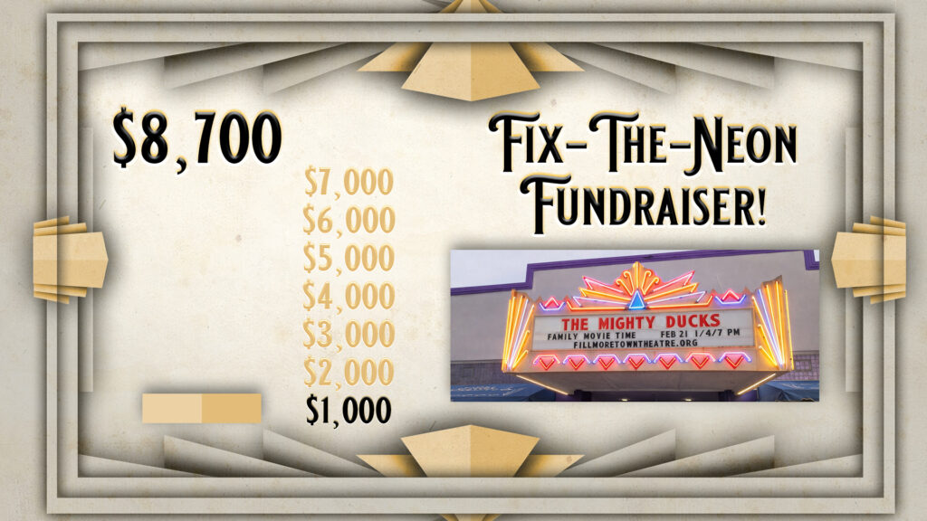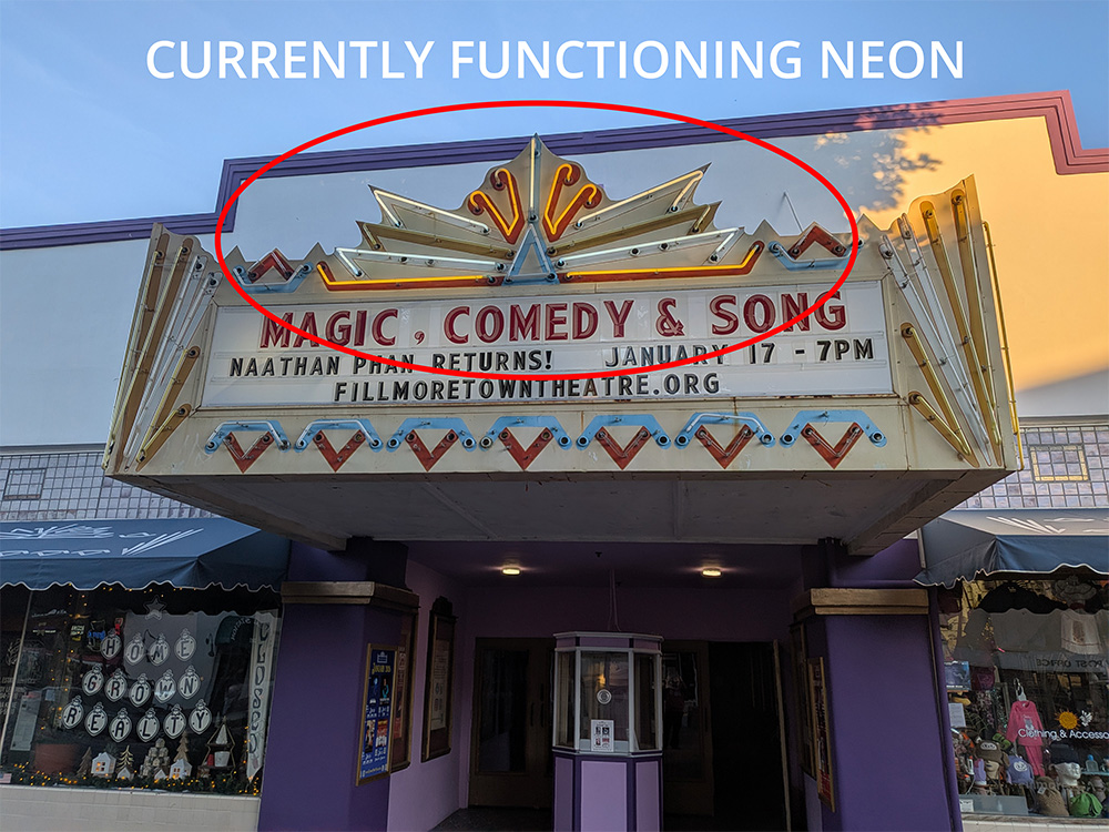 Restoring the neon is not cosmetic. A fully functioning marquee strengthens the theatre’s visibility, supports ticket sales, and reinforces its role as a cultural anchor for Fillmore. It’s an investment in both preservation and sustainability.